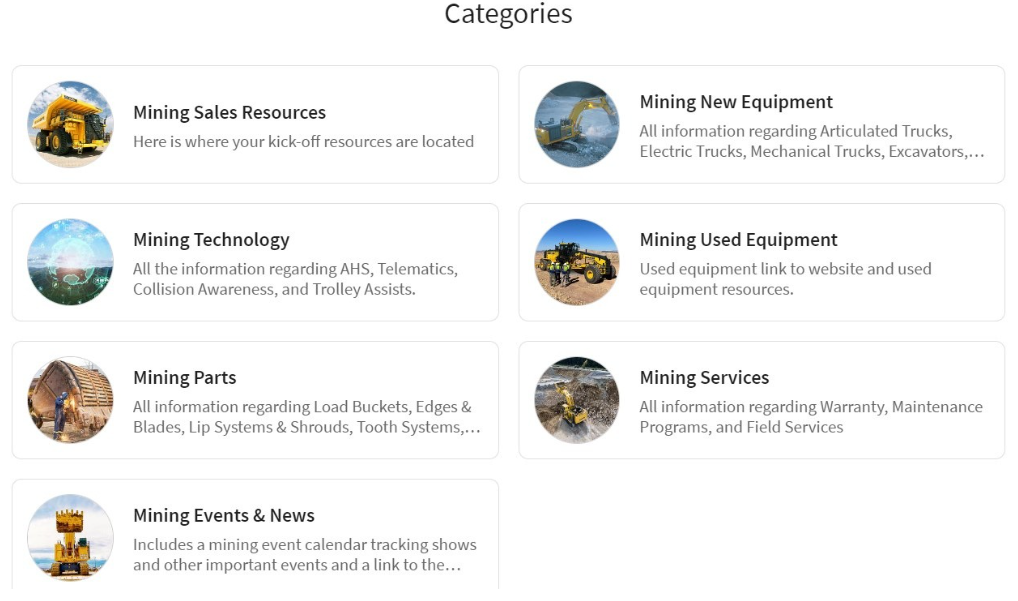 Here is a screenshot of the interface from the sales enablement tool I created for the mining sales reps. I had organized and populated the platform with content so that reps had easy access to all the content needed for pitches.
